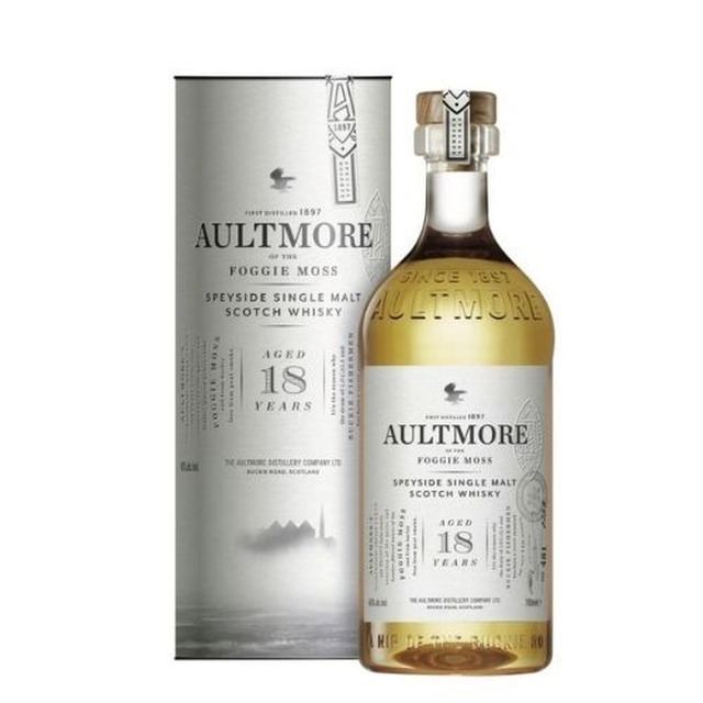 Aultmore 18 years, Este whisky de malta de Speyside es envejecido durante 18 años en barricas de roble blanco americano y se botella al 46% es una malta de Speyside rara conocida localmente como «una línea de contacto de la Ruta de Buckie. Filtra el agua de la destilería a través de la brumosa, misteriosa zona llamada Foggie Moss. Aultmore tiene una clasificación de primera clase y es un dram buscados por sus notas a hierbas suaves.