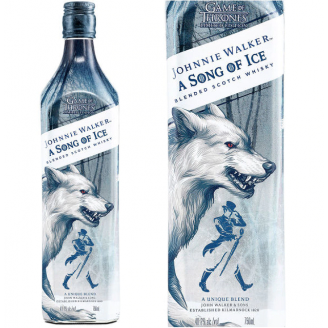 Johnnie Walker A Song of Ice Game Of Thrones es parte de la colección de dos surtidos dedicados a la famosa serie, la inspiración de la marca proviene de dos de las casas más poderosas de Game of Thrones. Esta expresión está dedicada a la casa Stark, por lo que la botella está decorada con el emblema Stark, el lobo, y la composición del blend sigue la línea creativa a través de notas y aromas. Johnnie Walker A Song of Ice Game Of Thrones tiene su origen en la destilería Clynelish, una de las más septentrionales de Escocia, y los single malts de su composición desarrollan un carácter nítido de fuerza inigualable, como el hielo. Su aroma combina el frescor de la fruta con acentos de turba para perfilar el aliento frío de un invierno interminable. Johnnie Walker A Song of Ice Game Of Thrones es un whisky extremadamente refrescante,