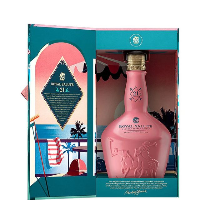 Royal Salute Miami Polo Edition está inspirada en la atractiva ciudad de Miami, corazón palpitante de la cultura y hogar de algunos de los clubes de polo más famosos del mundo. Como tributo a esta ciudad emblemática, el maestro mezclador de Royal Salute, Sandy Hyslop, ha creado una mezcla única de 21 años de influencia estadounidense, terminada en una mezcla armoniosa de barricas clásicas de bourbon de primer llenado y de centeno de primer llenado. Las suaves notas de vainilla y coco de las barricas de bourbon recuerdan a las playas de arena dorada de Miami y combinan perfectamente con las sutiles notas especiadas de las barricas de centeno.